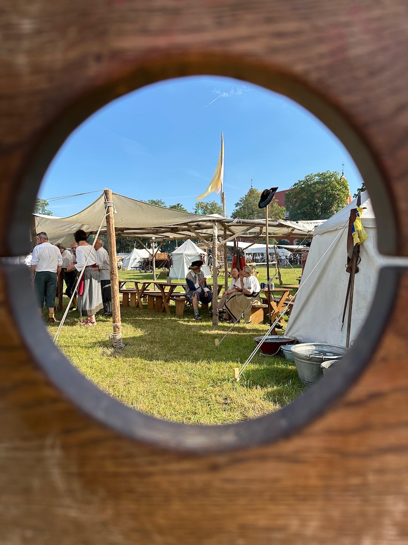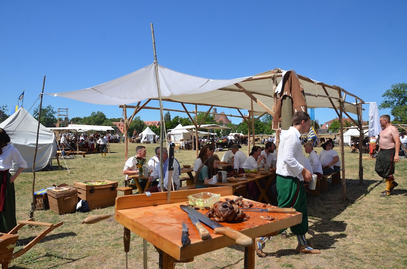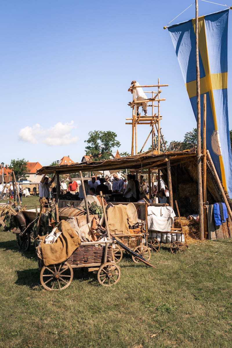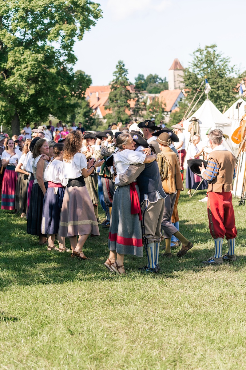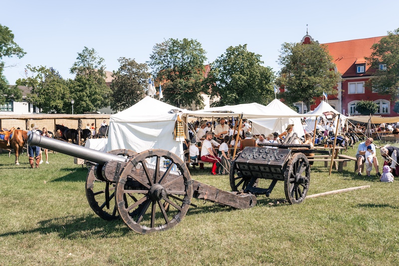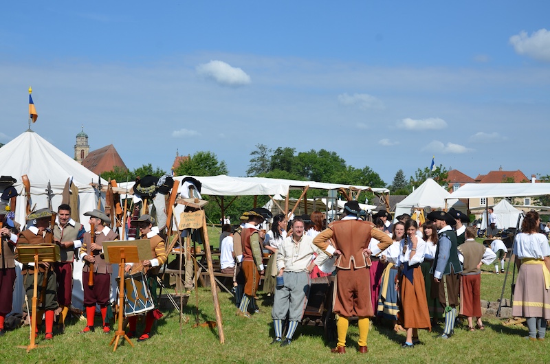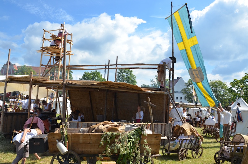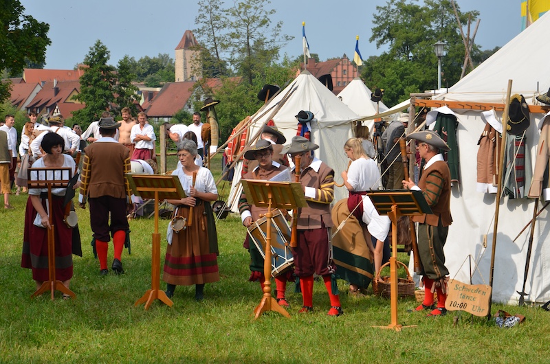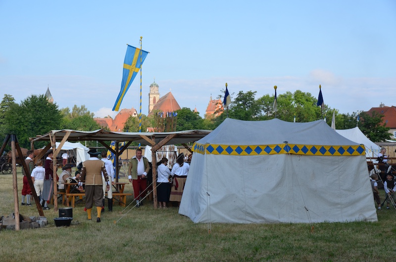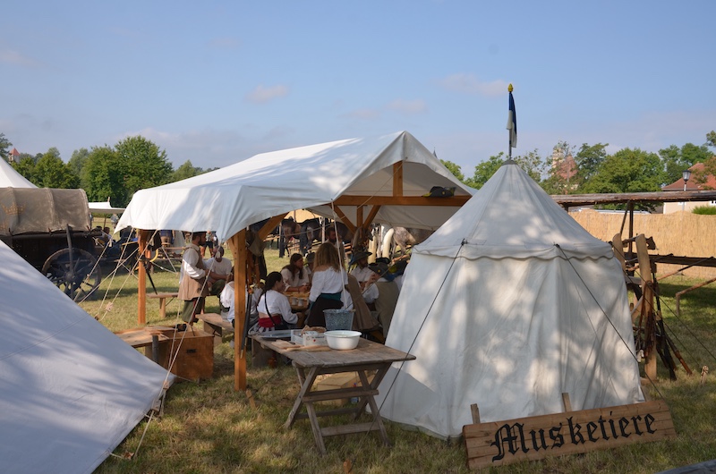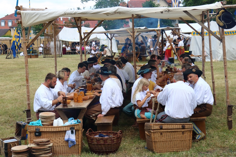 Die Rauschpfeifer spielen auf und begleiten die Schwedentänzer bei ihren Aufführungen. Die schwedischen Offiziere kümmern sich gemeinsam mit der Marketenderei um das Wohlergehen der Pferde, während die Kürassiere ihre schweren Rüstungen anlegen. Heereszahlmeister zählen den Sold, Marodeure halten Ausschau nach möglicher Beute, und der bunte Tross aus Kindern und Marketenderinnen rundet das lebendige Bild des Lagers ab.