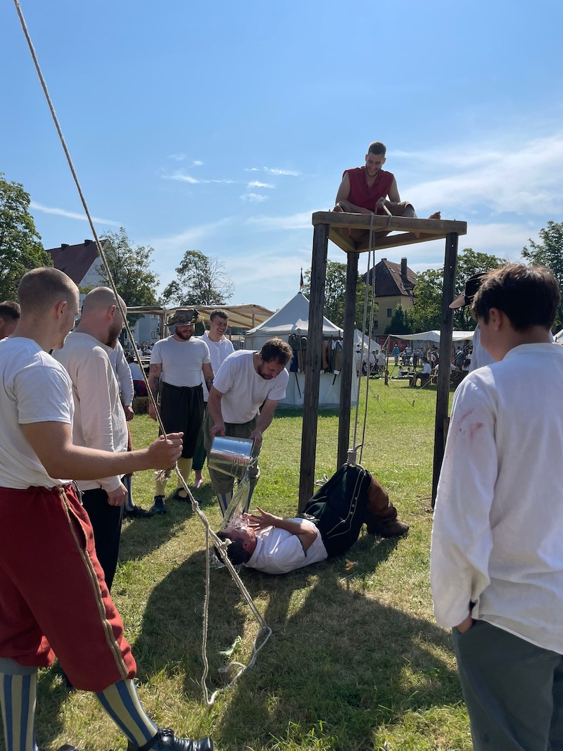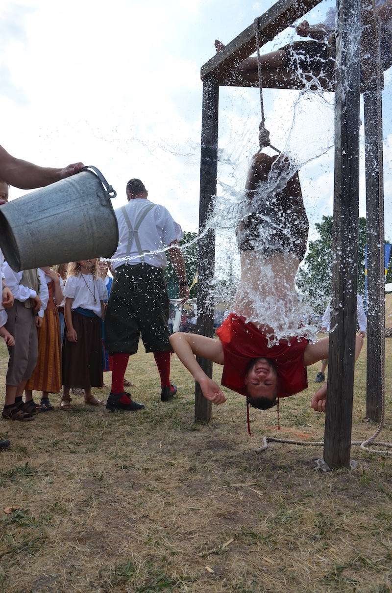 Im Schwedenlager führen die Drabanten sogenannte Schüttungen durch: Dabei werden Gefangene in der „Halsgeige“, einem historischen Folterinstrument, fixiert und anschließend mit einem Eimer kaltem Wasser „geschüttet“. Geahndet werden etwa Verrat am König, Ehebruch oder Diebstahl. Auch Neuankömmlinge im Lager werden mit einer Wassertaufe auf diese Weise willkommen geheißen.